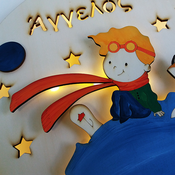 Wooden Wall Lamp with 3D Little prince with fox, rose, planets and stars. Hand-painted.