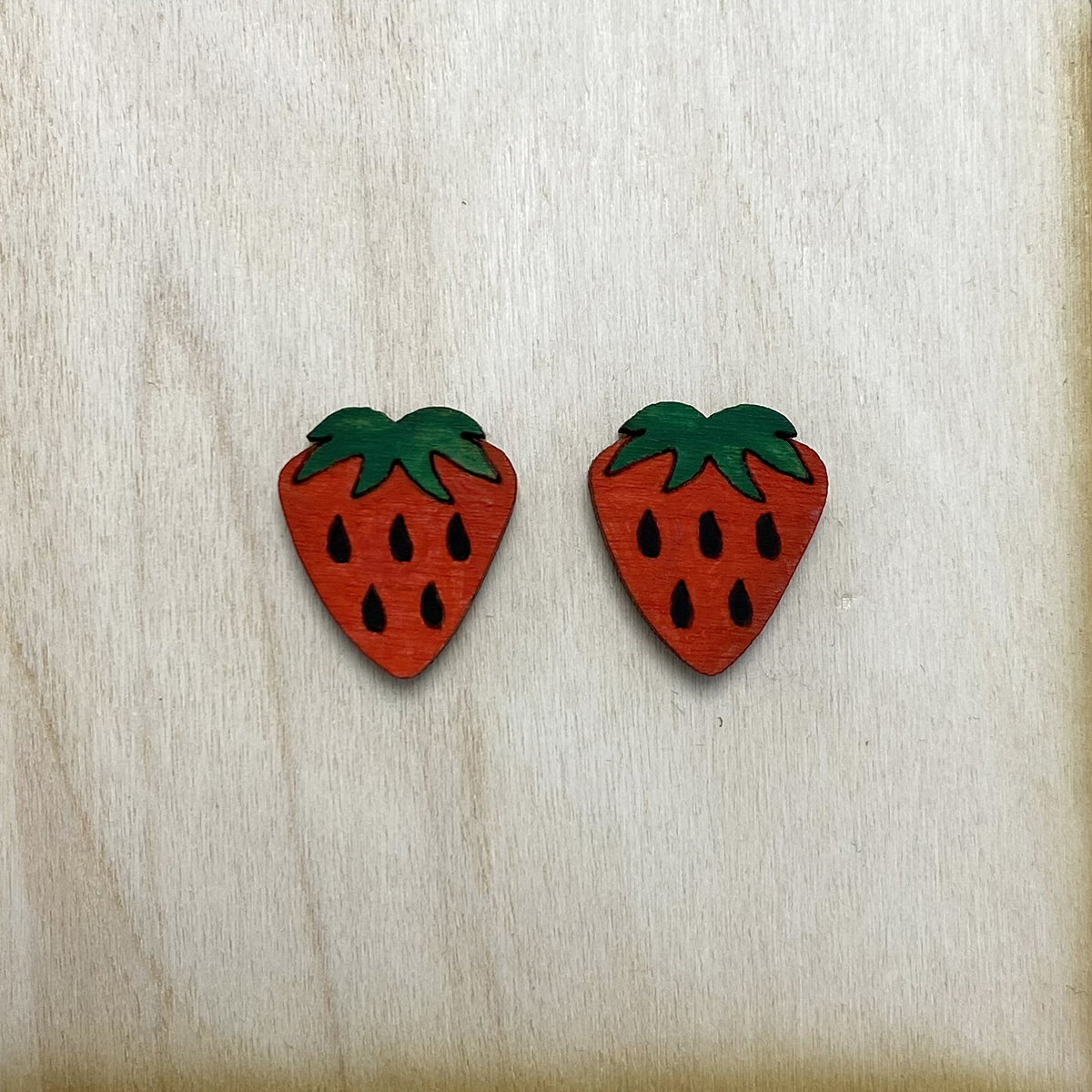 Ξύλινα σκουλαρίκια με σχέδιο φράουλας.