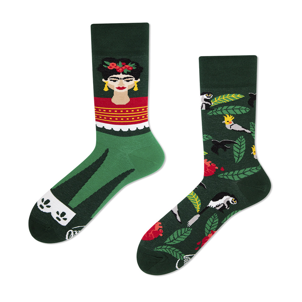 Η Φρίντα μας έδειξε ότι τίποτα δεν είναι αδύνατο όσο έχεις ένα τολμηρό πνεύμα, μπορεί να μάθει από τα χαμηλά σημεία της ζωής σου, και ακόμη και ότι ένα μονόδρομο μπορεί να είναι αρκετά η δήλωση μόδας. Θέλαμε να ταιριάξουμε αυτές τις κάλτσες με τις εμβληματικές ιδέες της και να δημιουργήσουμε κάτι εκφραστικό. Φρίντα κάλτσες σε πράσινο, λευκό και κόκκινο. Το πρόσωπο της Φρίντα, τα φυτά, τα ζώα και ένα μοτίφ καρδινάλιο που αιμορραγεί δίνει σε αυτές τις κάλτσες ένα οπτικά πλούσιο σχέδιο.