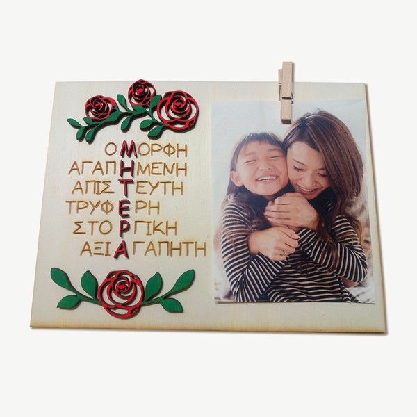 Ξύλινη κορνίζα για τη Μητέρα με χαραγμένα επίθετα. Ζωγραφισμένη στο χέρι.