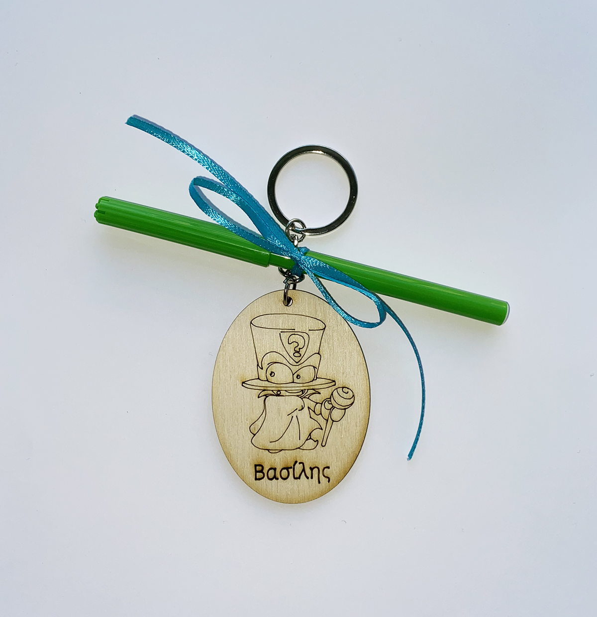 Στην περίπτωση που επιλέξετε να συνοδεύονται από μαρκαδόρο, αυτός είναι δεμένος με κορδελίτσα ροζ, γαλάζια ή πράσινη. Οι μαρκαδόροι τοποθετούνται τυχαία στο κάθε μπρελόκ και δεν υπάρχει δυνατότητα επιλογής συγκεκριμένου χρώματος. Τα κορδελάκια είναι ροζ για τα κοριτσάκια και γαλάζια ή πράσινα για τα αγοράκια.