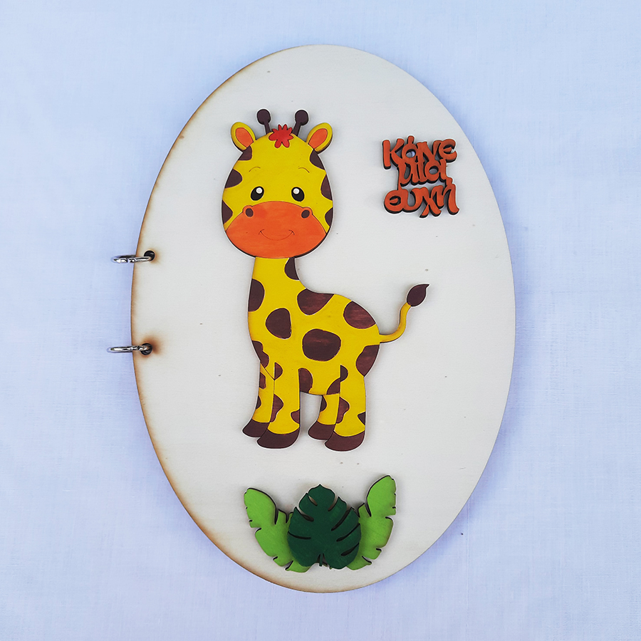 Ξύλινο βιβλίο ευχών βάπτισης Καμηλοπάρδαλη δώδεκα σελίδων μπρίστολ με μεταλλικούς κρίκους.