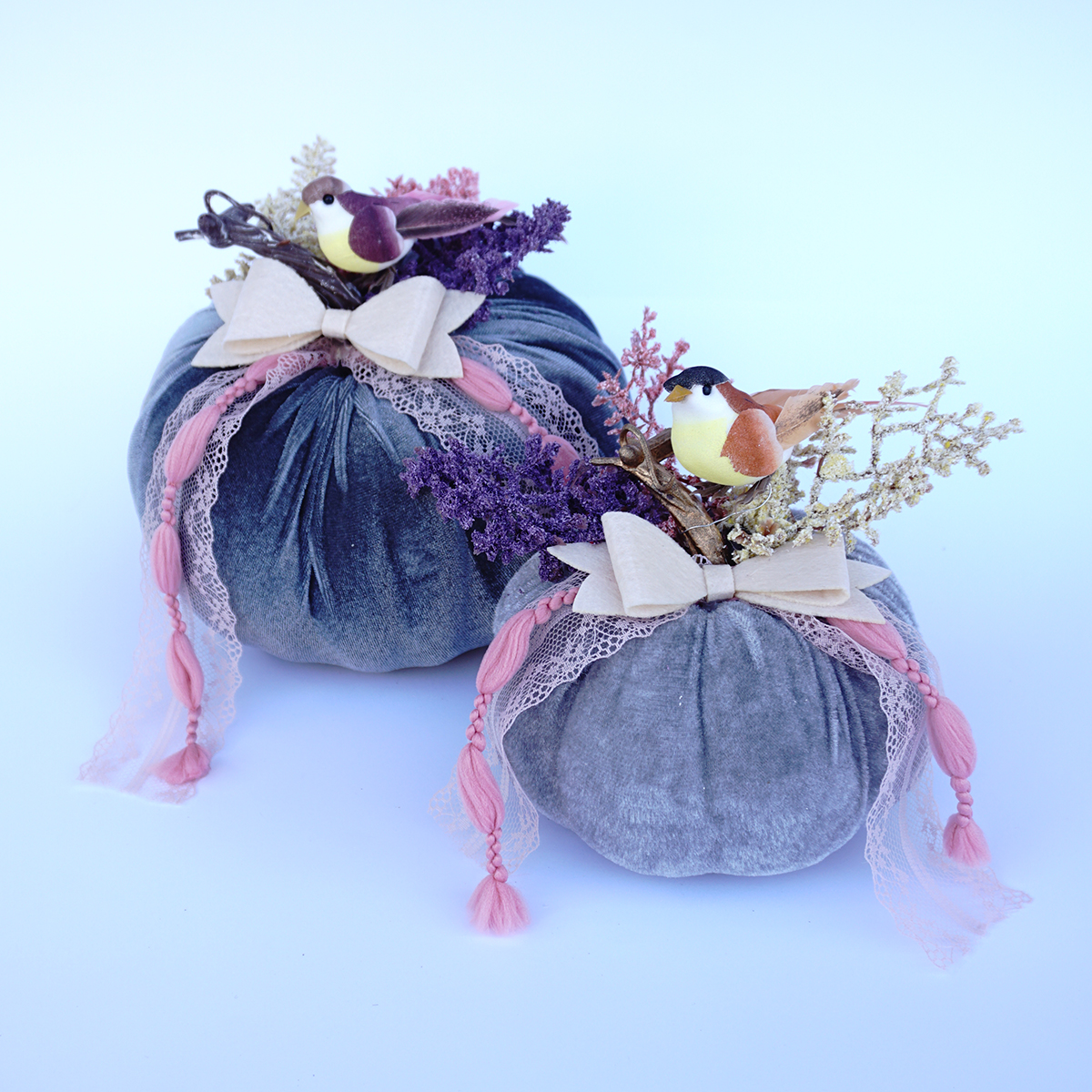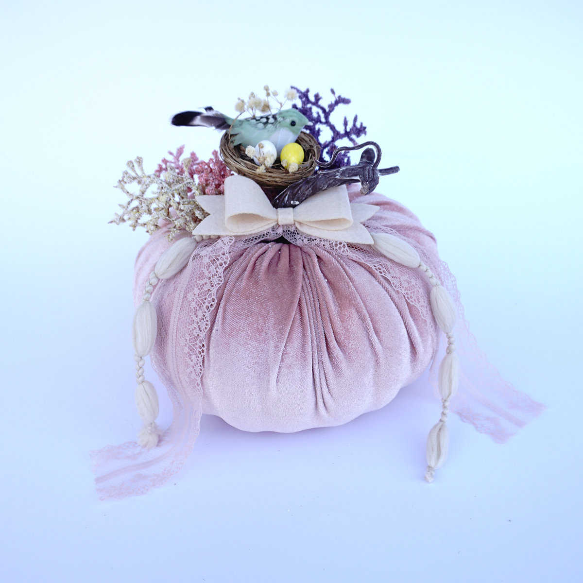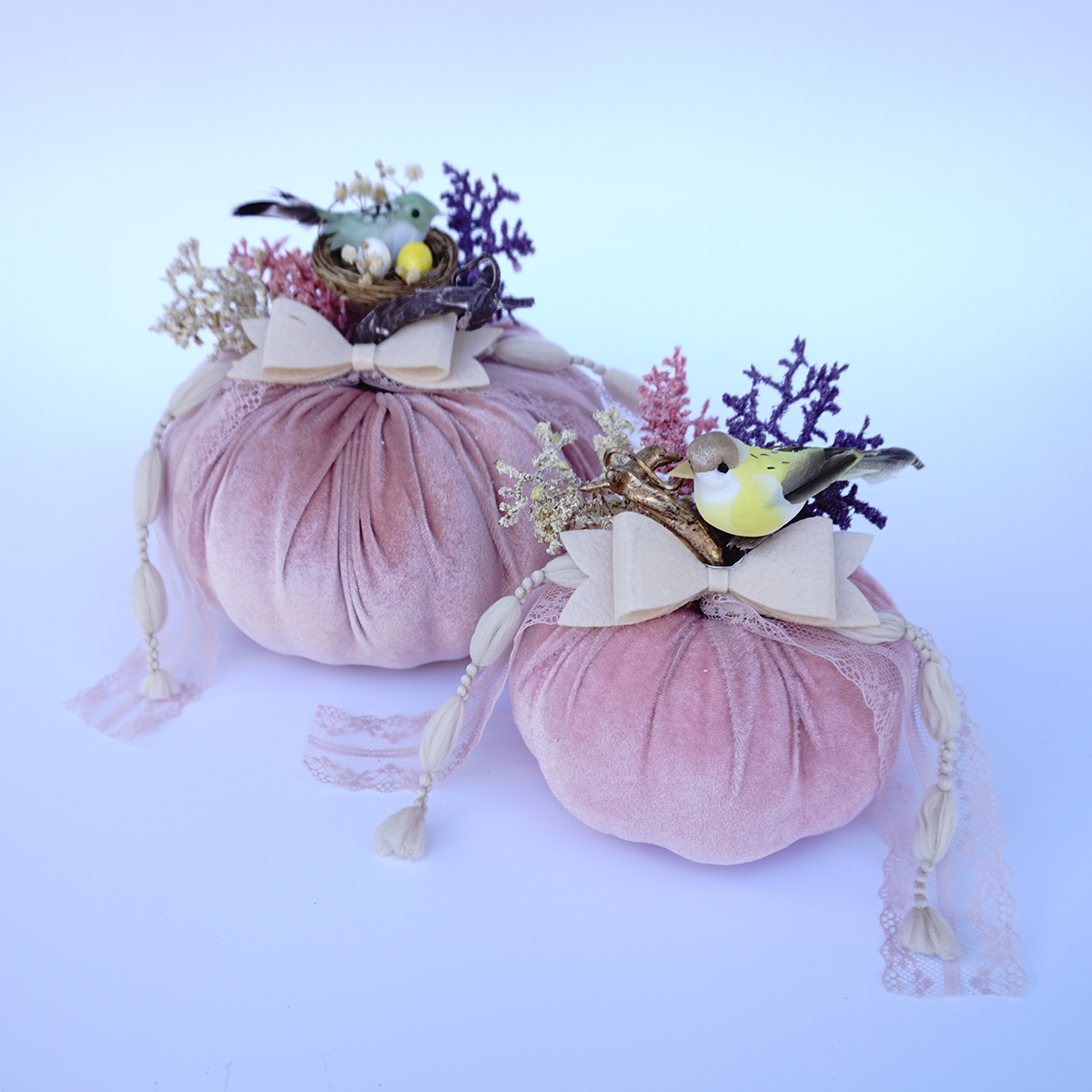 Κολοκύθες σε ανοιξιάτικο καλοκαιρινό θέμα με διακόσμιση μικρών πτηνών σε τρία χρώματα: μπεζ, ροζ & γκρι