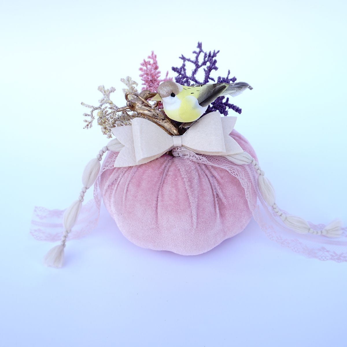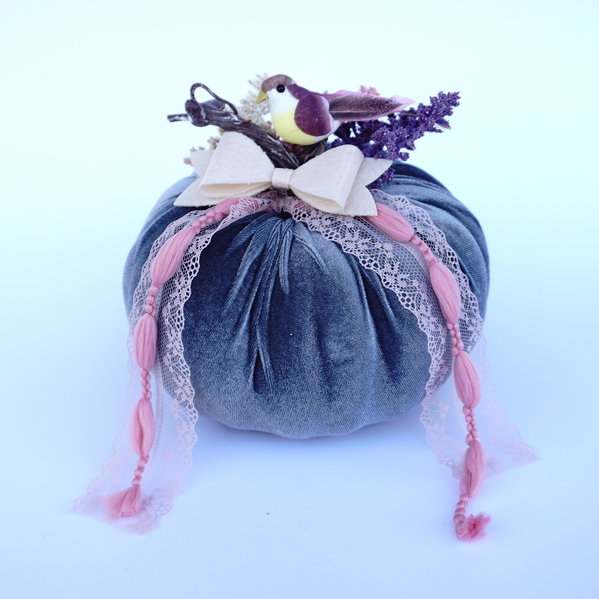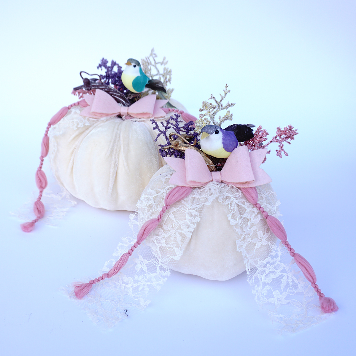 Κολοκύθες σε ανοιξιάτικο καλοκαιρινό θέμα με διακόσμιση μικρών πτηνών σε τρία χρώματα: μπεζ, ροζ & γκρι