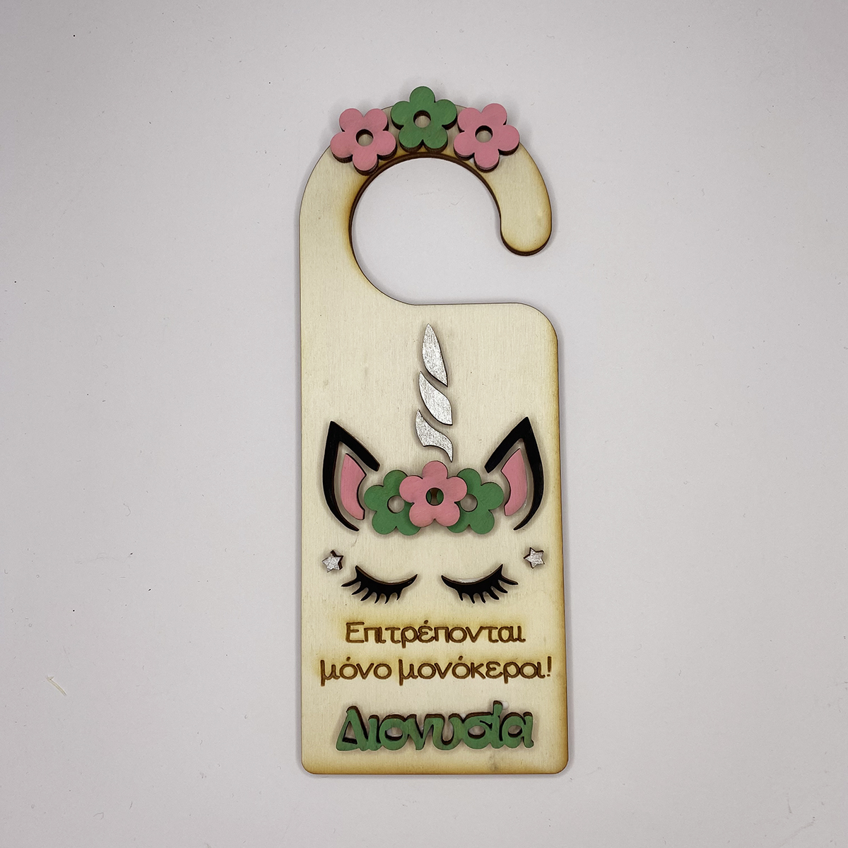 Κρεμαστό για το πόμολο της πόρτας με θέμα μονόκερος και το όνομα της επιλογής σας.