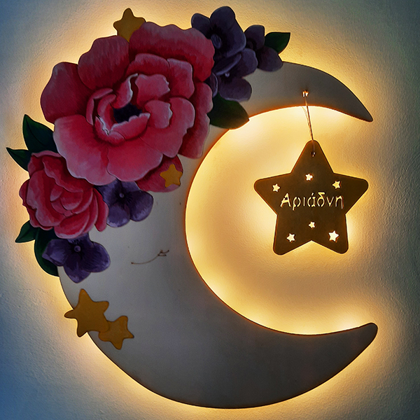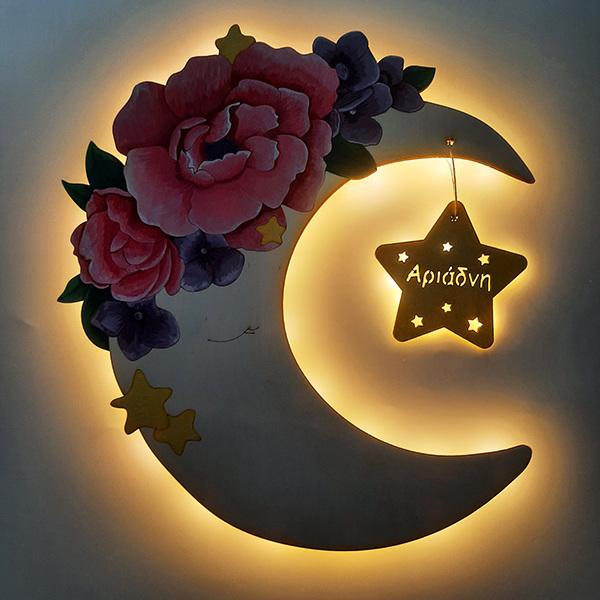 Ξύλινο Επιτοίχιο Φωτιστικό φεγγάρι με αστέρι με λουλούδια ζωγραφισμένο στο χέρι.