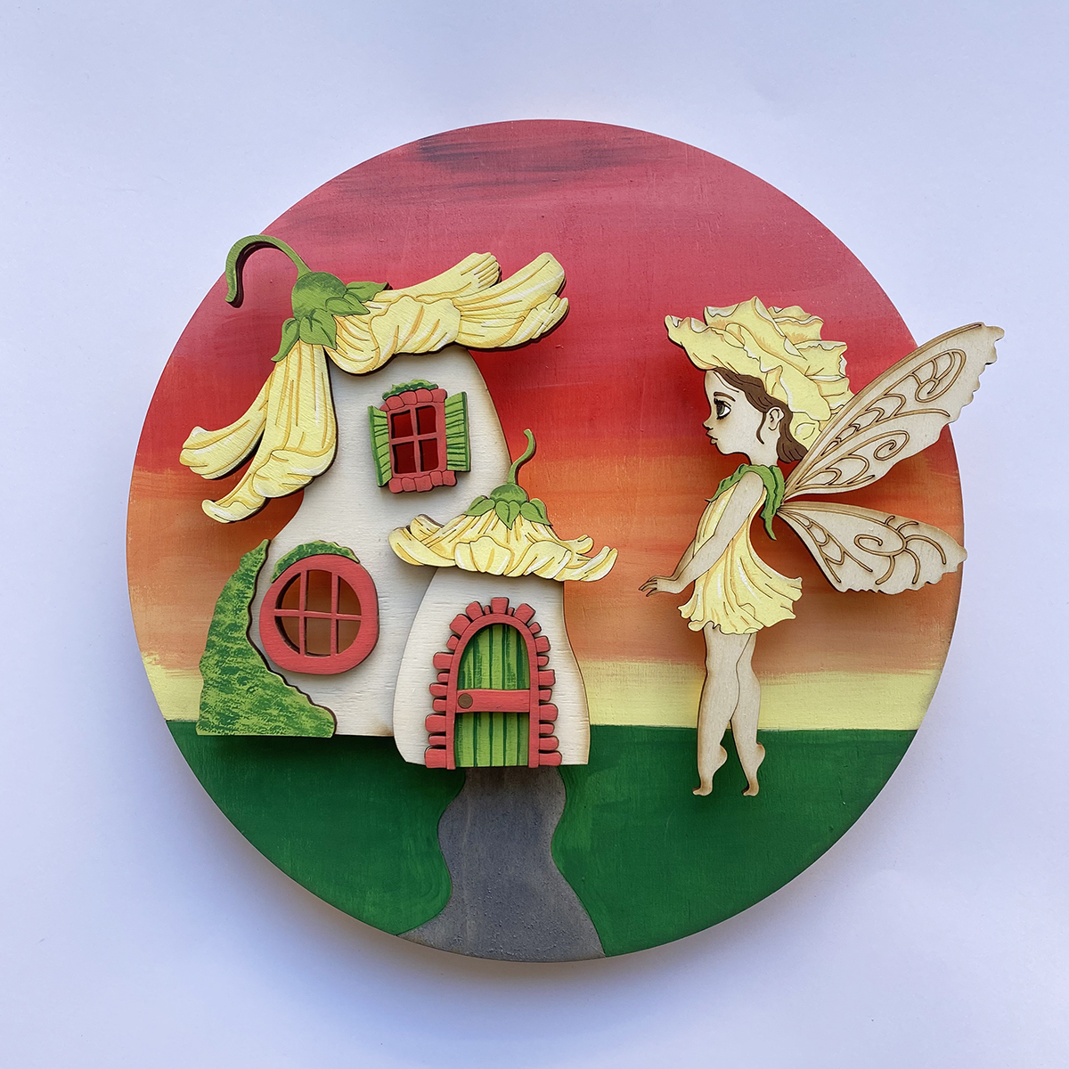 Ξύλινο Επιτοίχιο Φωτιστικό με κίτρινη Λουλουδένια Νεράιδα ζωγραφισμένο στο χέρι.