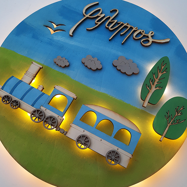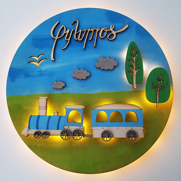 Ξύλινο Επιτοίχιο Φωτιστικό με Τρένο 3D και το όνομα της επιλογής σας ζωγραφισμένο στο χέρι.