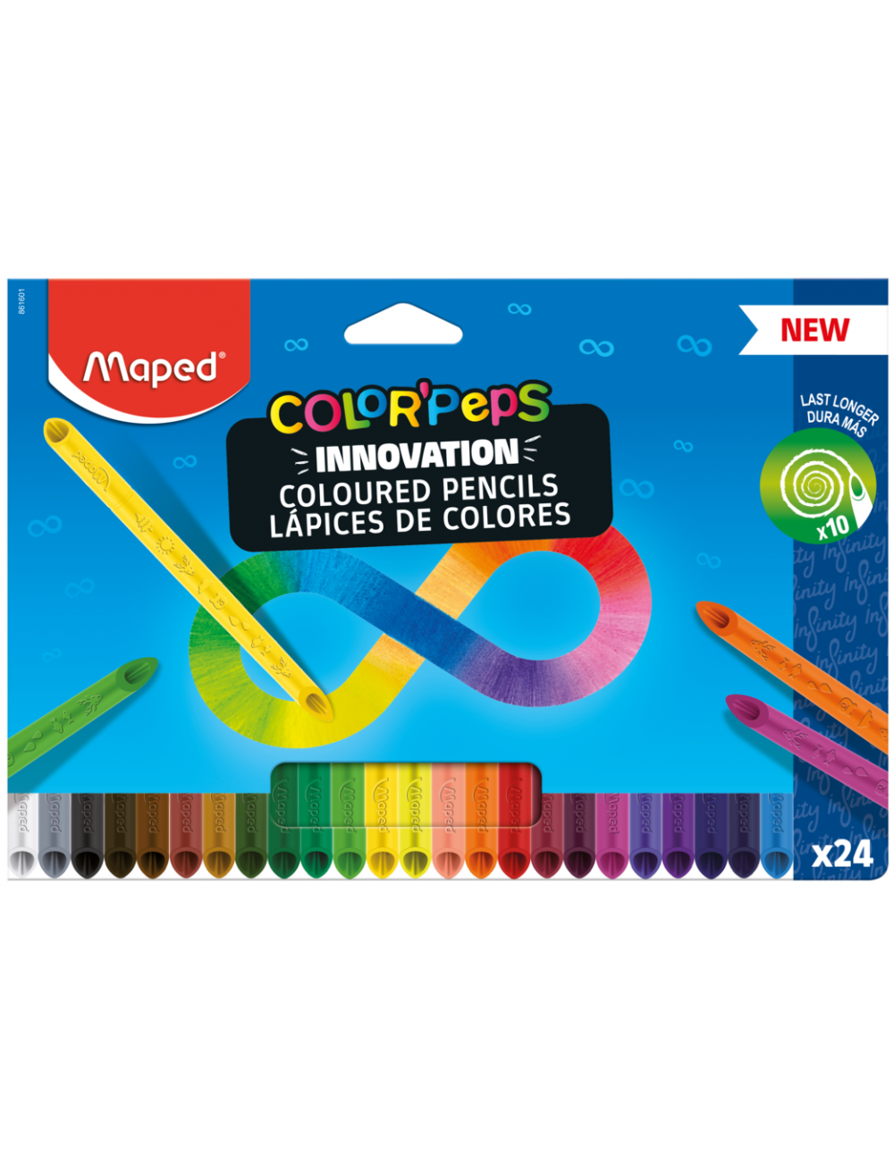 Η ξυλομπογιά Infinity της Maped διαρκεί 10 φορές περισσότερο από την ξυλομπογιά Strong της Maped. Καθώς αποτελείται από 100% μύτη μπορείτε να την χρησιμοποιήσετε μέχρι το τέλος. Δεν χρειάζεται ξύσιμο. Είναι εργονομική καθώς έχει τριγωνικό σχήμα για καλύτερο κράτημα. Είναι σχεδιασμένη με βάση τους ισχύοντες κανονισμούς των παιχνιδιών. Η πρωτότυπη πατενταρισμένη ξυλομπογιά της Maped επιτρέπει στα παιδιά να ζωγραφίζουν και από τις δύο πλευρές της ξυλομπογιάς.