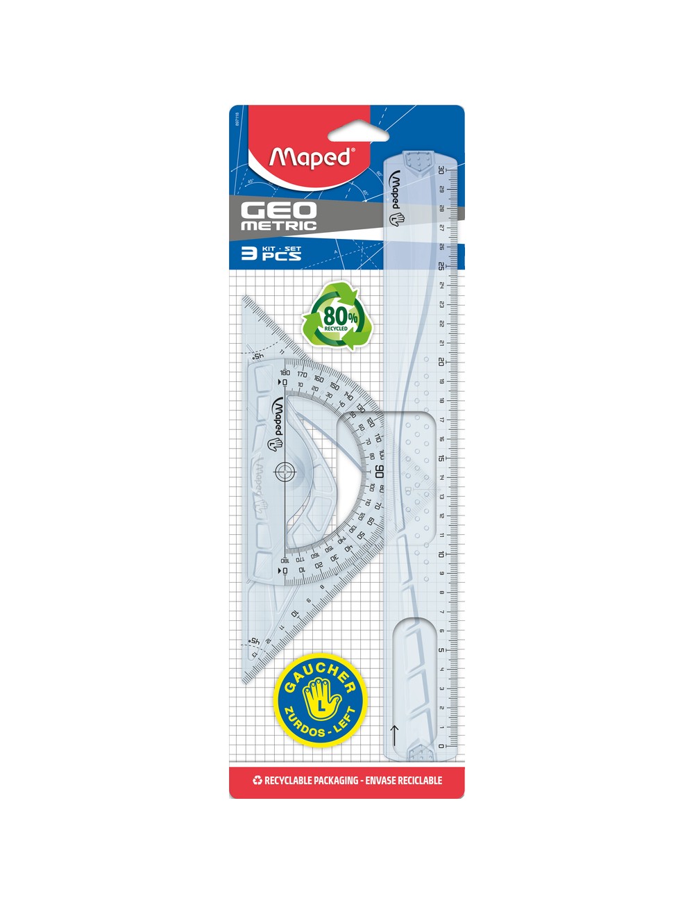 Το γεωμετρικό σετ για αριστερόχειρες περιλαμβάνει ένα χάρακα 30 εκατοστών, ένα μοιρογνωμόνιο 180 μοιρών μήκους 12 εκατοστών και ένα τρίγωνο 45 μοιρών με υποτείνουσα 21 εκατοστών. Είναι κατασκευασμένο από 80% ανακυκλωμένο υλικό και η συσκευασία είναι από ανακυκλωμένο χαρτόνι.
