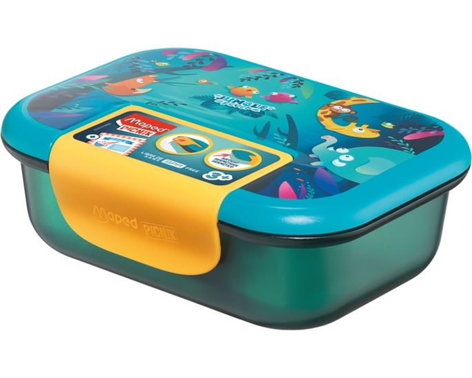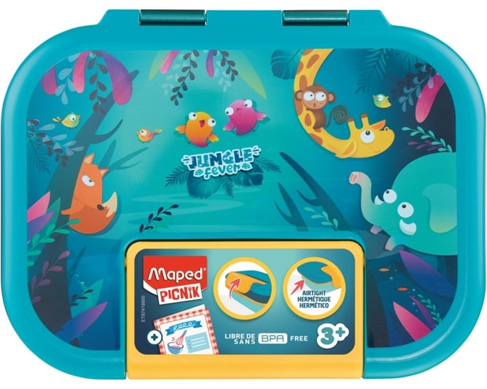 Το φαγητοδοχείο Jungle Fever της Maped έχει χωρητικότητα 900ml και είναι κατάλληλο για ηλικίες 3+ Είναι κατασκευασμένο από ένα βιολογικό υλικό Ecozen το οποίο ανακυκλώνεται πολύ εύκολα. Ανοίγει με μία μόνο κίνηση χάρη στο κλιπ / καπάκι που διαθέτει. Το καπάκι είναι ενσωματωμένο στο φαγητοδοχείο, οπότε ποτέ δεν θα το χάσετε. Εξαιρετικά πρακτικό ορθογώνιο σχήμα για να χωρέσει ένα γεύμα. Είναι αεροστεγή και μπαίνει στο φούρνο μικροκυμάτων με ανοιχτό το καπάκι. Πλένται στον πλυντήριο των πιάτων. Η συσκευασία περιλαμβάνει ένα βιβλιαράκι με συνταγές για γεύματα υγιεινά για τα παιδιά μας.