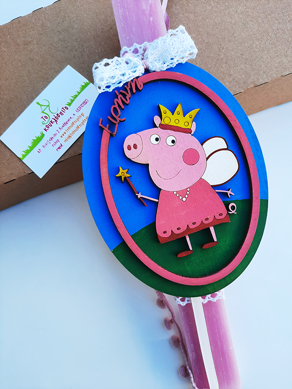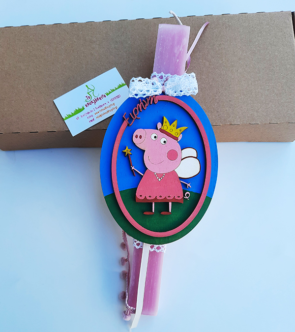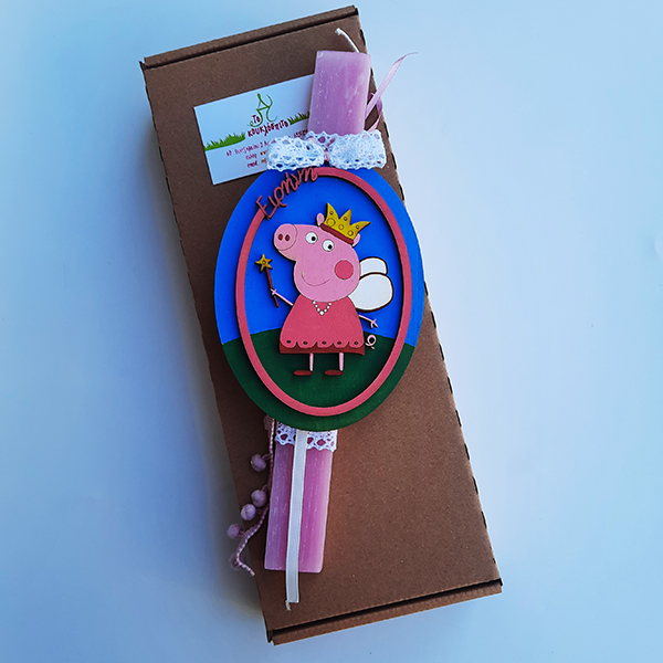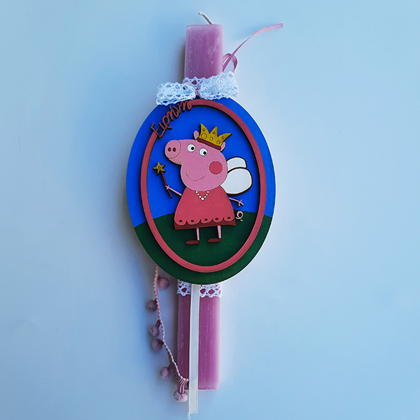 Πασχαλινή Λαμπάδα με καδράκι γουρουνάκι με όνομα σε ξυστό αρωματικό κερί σε ροζ απόχρωση.