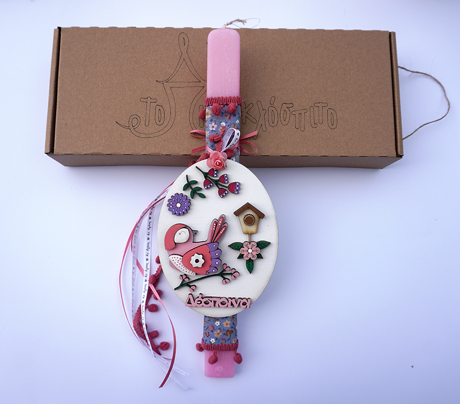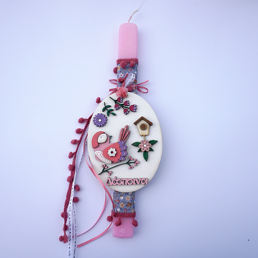 Πασχαλινή Λαμπάδα με διακοσμητικό καδράκι, με πουλάκι, κλουβί, λουλούδια και όνομα σε ξυστό αρωματικό κερί σε ροζ απόχρωση και με φλοράλ επένδυση.