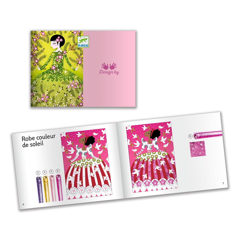 Η συσκευασία περιέχει 4 πατρον-φορέματα, αξεσουάρ διακόσμησης καθώς και 6 σωληνάρια με χρυσόσκονη-glitter διαφορετικών χρωμάτων