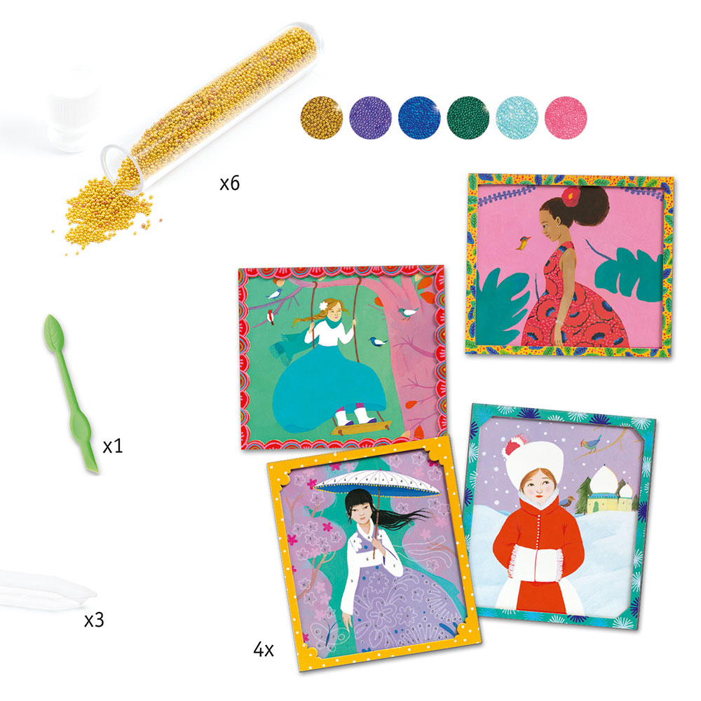 Το ιδιαίτερο κολάζ με μικροπέρλες από την εταιρία Djeco ήρθε για να διεγείρει την έμπνευση και τη φαντασία των μικρών καλλιτεχνών. Με θέμα τις κοπέλες διαφορετικών φυλών το παιδί θα διασκεδάσει αλλά παράλληλα θα γνωρίσει ενδυμασίες άλλων λαών. Η χρήση του είναι απλή. Χρησιμοποιήστε το ειδικό εργαλείο για να βγάλετε το αυτοκόλλητο από τις περιοχές που πρέπει και ρίξτε προσεκτικά τις χάντρες για να δημιουργήσετε ένα λαμπερό κολάζ. Η συσκευασία περιλαμβάνει το εργαλείο για να ξεκολλήσετε το αυτοκόλλητο, 4 καρτέλες για να δημιουργήσετε, 6 δοχεία διαφορετικού χρώματος με μικροπέρλες, 3 δοχεία απόθεσης και ένα βιβλίο οδηγιών. Είναι κατάλληλο για παιδιά άνω των 7 ετών. Διαστάσεις Συσκευασίας: 18.5 x 15.5 x3 εκ.
